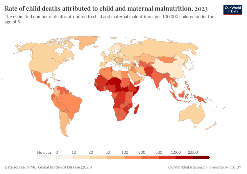 IHME, Global Burden of Disease (2025) – with major processing by Our World in Data. “Rate of child deaths attributed to child and maternal malnutrition” [dataset]. IHME, Global Burden of Disease, “Global Burden of Disease - Risk Factors - Deaths” [original data]. Retrieved March 5, 2026 from https://ai-search-suggested-topics-k.owid.pages.dev/grapher/rate-of-child-deaths-attributed-to-child-and-maternal-malnutrition