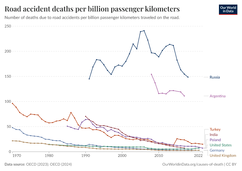 “Data Page: Road accident deaths per billion passenger kilometers”, part of the following publication: Hannah Ritchie and Max Roser (2021) - “Transport”. Data adapted from OECD. Retrieved from https://ai-search-suggested-topics-k.owid.pages.dev/grapher/road-accident-deaths-per-passenger-kilometers [online resource]How to cite this data