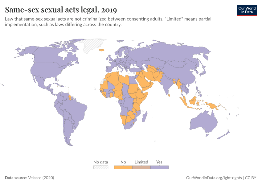 “Data Page: Same-sex sexual acts legal”, part of the following publication: Bastian Herre and Pablo Arriagada (2023) - “LGBT+ Rights”. Data adapted from Velasco. Retrieved from https://ai-search-suggested-topics-k.owid.pages.dev/grapher/same-sex-sexual-acts-legal [online resource]How to cite this data