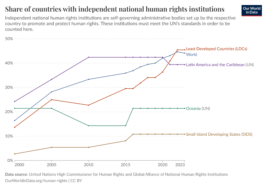 United Nations High Commissioner for Human Rights and Global Alliance of National Human Rights Institutions – processed by Our World in Data. “Share of countries with independent national human rights institutions” [dataset]. United Nations High Commissioner for Human Rights and Global Alliance of National Human Rights Institutions, “Source: The Office of the United Nations High Commissioner for Human Rights (OHCHR) in collaboration with Global Alliance of National Human Rights Institutions (GANHRI).” [original data]. Retrieved March 5, 2026 from https://ai-search-suggested-topics-k.owid.pages.dev/grapher/share-countries-accredited-independent-national-human-rights-institutions