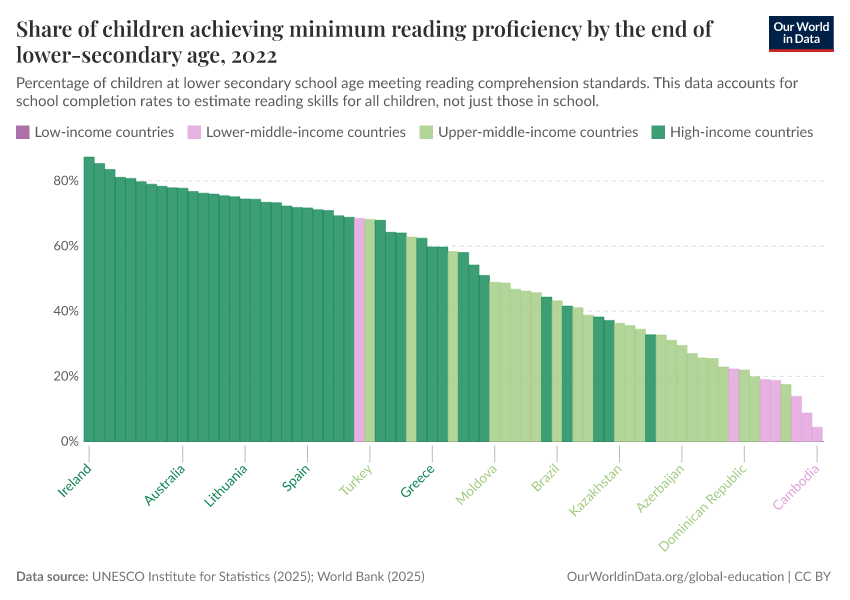 UNESCO Institute for Statistics (2025) – with minor processing by Our World in Data. “Share of children achieving minimum reading proficiency by the end of lower secondary age” [dataset]. UNESCO Institute for Statistics, “UNESCO Institute for Statistics (UIS) - Education” [original data]. Retrieved March 5, 2026 from https://ai-search-suggested-topics-k.owid.pages.dev/grapher/share-of-children-reaching-sufficient-reading-comprehension-by-the-end-of-lower-secondary-age