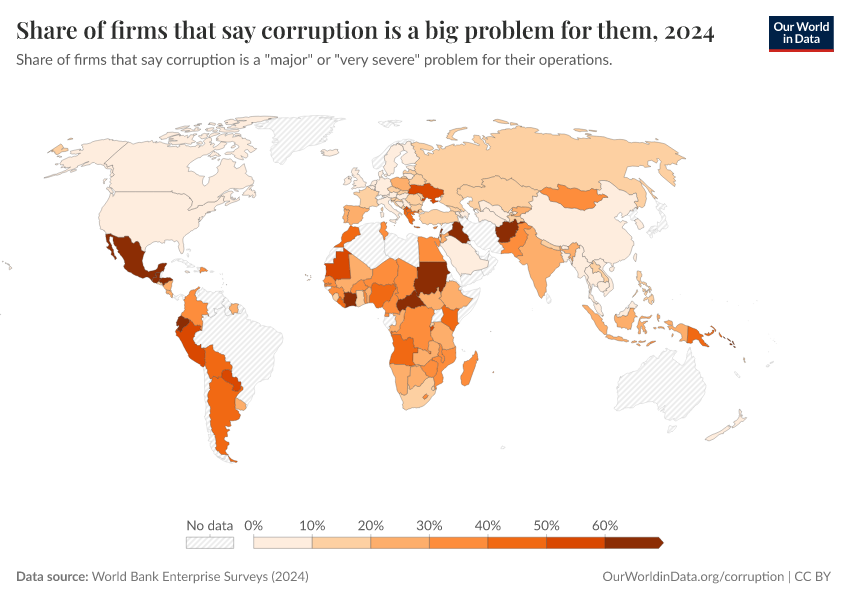 World Bank Enterprise Surveys (2024) – with minor processing by Our World in Data. “Share of firms that say corruption is a big problem for them” [dataset]. World Bank Enterprise Surveys, “Enterprise Surveys - Corruption” [original data]. Retrieved March 5, 2026 from https://ai-search-suggested-topics-k.owid.pages.dev/grapher/share-of-firms-that-say-corruption-is-a-big-problem-for-them