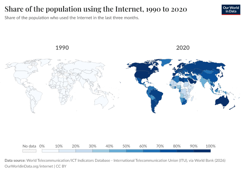 World Telecommunication/ICT Indicators Database - International Telecommunication Union (ITU), via World Bank (2026) – with minor processing by Our World in Data. “Share of the population using the Internet – International Telecommunication Union” [dataset]. World Telecommunication/ICT Indicators Database - International Telecommunication Union (ITU), via World Bank, “World Development Indicators 125” [original data]. Retrieved March 5, 2026 from https://ai-search-suggested-topics-k.owid.pages.dev/grapher/share-of-individuals-using-the-internet