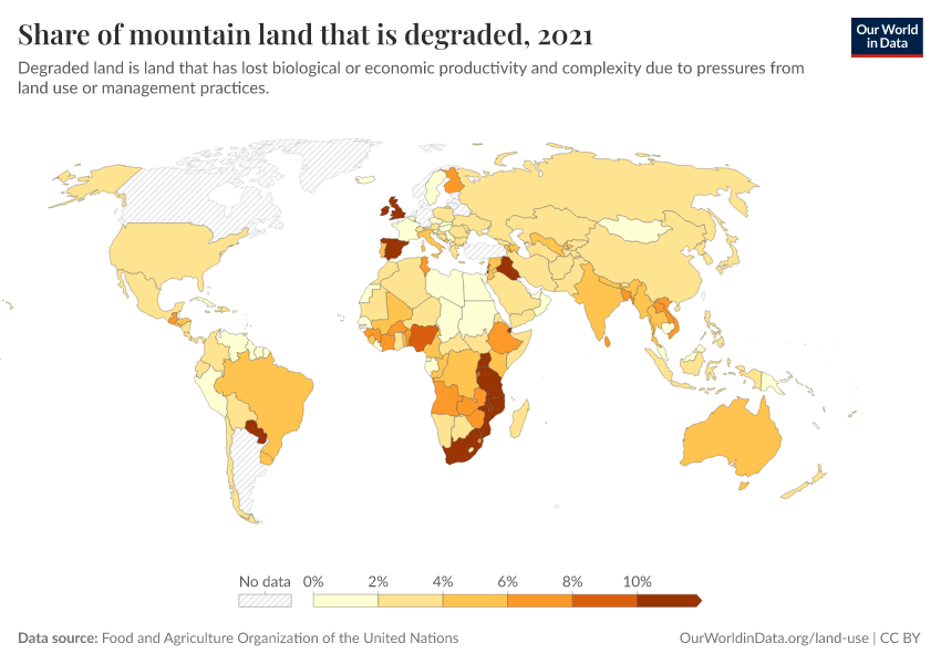 Food and Agriculture Organization of the United Nations – processed by Our World in Data. “Share of mountain land that is degraded” [dataset]. Food and Agriculture Organization of the United Nations, “Food and Agriculture Organization of the United Nations (FAO), South African National Biodiversity Institute (SANBI), Instituto Brasileiro de Geografia e Estatística (IBGE)” [original data]. Retrieved March 5, 2026 from https://ai-search-suggested-topics-k.owid.pages.dev/grapher/share-of-mountain-land-that-is-degraded