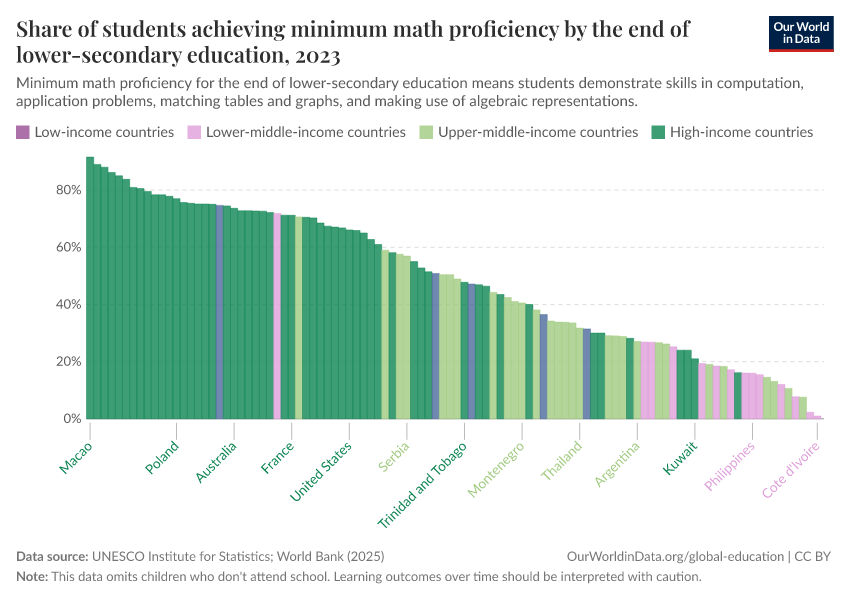 UNESCO Institute for Statistics – processed by Our World in Data. “Share of students achieving minimum math proficiency by the end of lower-secondary education” [dataset]. UNESCO Institute for Statistics, “Data from multiple sources” [original data]. Retrieved March 5, 2026 from https://ai-search-suggested-topics-k.owid.pages.dev/grapher/share-of-students-at-end-of-lower-secondary-education-achieving-minimum-math-proficiency