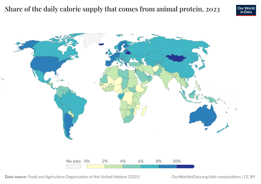 Food and Agriculture Organization of the United Nations (2025) – with major processing by Our World in Data. “Share of the daily calorie supply that comes from animal protein – FAO” [dataset]. Food and Agriculture Organization of the United Nations, “Food Balances: Food Balances (-2013, old methodology and population)”; Food and Agriculture Organization of the United Nations, “Food Balances: Food Balances (2010-)” [original data]. Retrieved March 5, 2026 from https://ai-search-suggested-topics-k.owid.pages.dev/grapher/share-of-the-daily-calorie-supply-that-comes-from-animal-protein