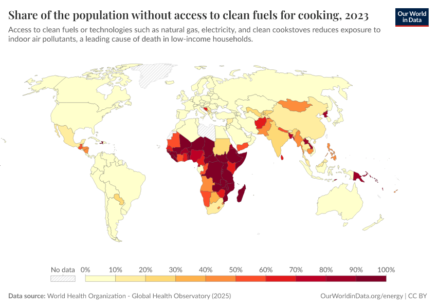 World Health Organization - Global Health Observatory (2025) – processed by Our World in Data. “Share of the population without access to clean fuels for cooking” [dataset]. World Health Organization, “Global Health Observatory” [original data]. Retrieved March 5, 2026 from https://ai-search-suggested-topics-k.owid.pages.dev/grapher/share-of-the-population-without-access-to-clean-fuels-for-cooking
