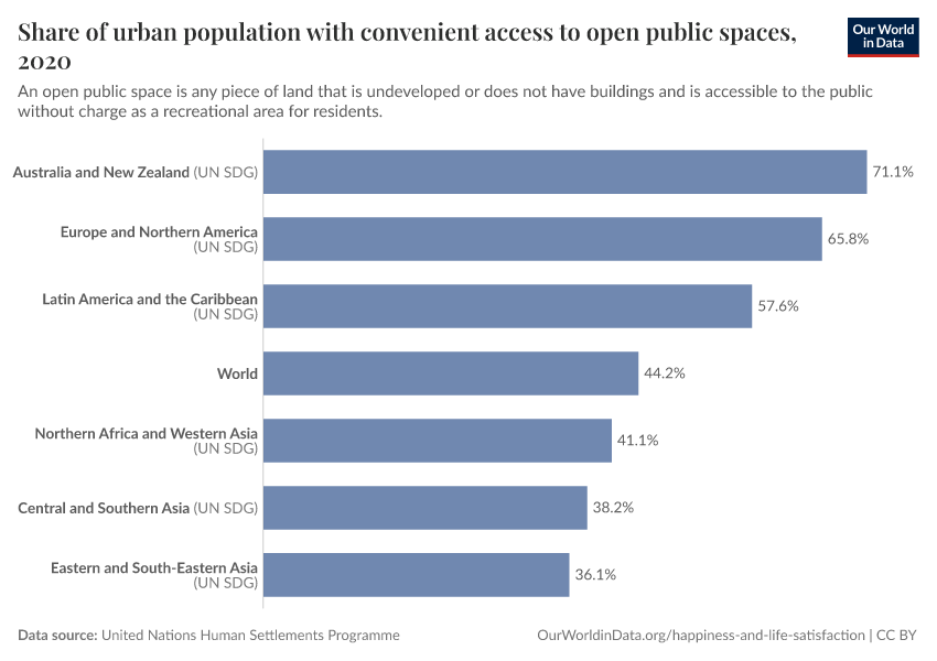 “Data Page: Share of urban population with convenient access to open public spaces”. Our World in Data (2026). Data adapted from United Nations Human Settlements Programme. Retrieved from https://ai-search-suggested-topics-k.owid.pages.dev/grapher/share-of-urban-population-with-convenient-access-to-open-public-spaces [online resource]How to cite this data