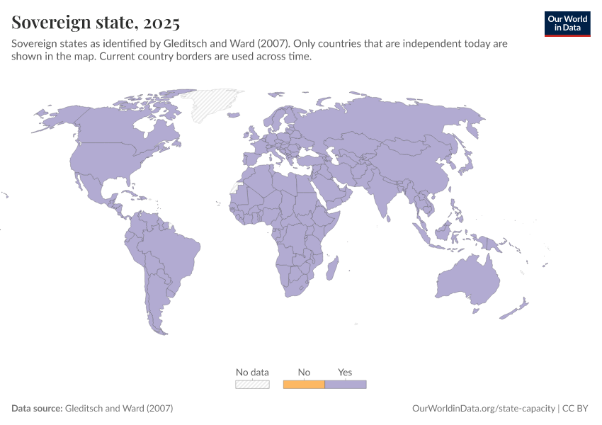 “Data Page: Sovereign state”, part of the following publication: Bastian Herre and Pablo Arriagada (2023) - “State Capacity”. Data adapted from Gleditsch and Ward. Retrieved from https://ai-search-suggested-topics-k.owid.pages.dev/grapher/sovereign-state-gleditsch-ward [online resource]How to cite this data