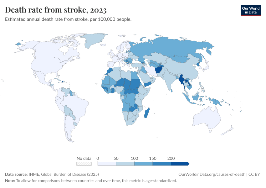 IHME, Global Burden of Disease (2025) – with major processing by Our World in Data. “Death rate from stroke” [dataset]. IHME, Global Burden of Disease, “Global Burden of Disease - Deaths” [original data]. Retrieved March 5, 2026 from https://ai-search-suggested-topics-k.owid.pages.dev/grapher/stroke-death-rates