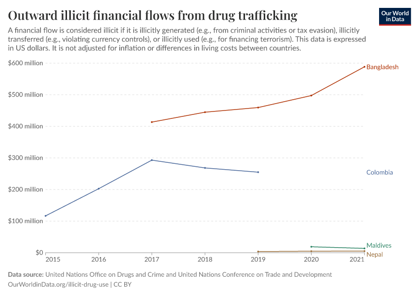 United Nations Office on Drugs and Crime and United Nations Conference on Trade and Development – processed by Our World in Data. “Outward illicit financial flows from drug trafficking” [dataset]. United Nations Office on Drugs and Crime and United Nations Conference on Trade and Development, “Data from multiple sources” [original data]. Retrieved March 5, 2026 from https://ai-search-suggested-topics-k.owid.pages.dev/grapher/total-outward-financial-flows-from-drug-trafficking