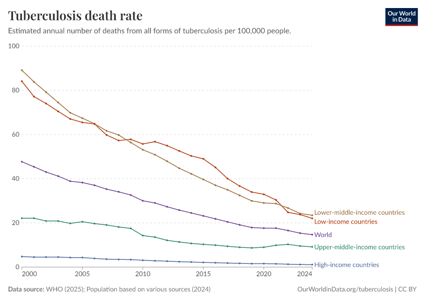 “Data Page: Tuberculosis death rate”, part of the following publication: Saloni Dattani, Fiona Spooner, Hannah Ritchie, and Max Roser (2023) - “Tuberculosis”. Data adapted from WHO, Various sources. Retrieved from https://ai-search-suggested-topics-k.owid.pages.dev/grapher/tuberculosis-death-rate [online resource]