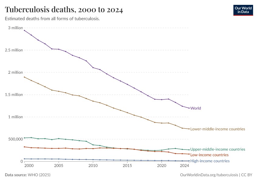 WHO (2025) – with minor processing by Our World in Data. “Tuberculosis deaths” [dataset]. WHO, “Global Tuberculosis Report - Burden Estimates” [original data]. Retrieved March 5, 2026 from https://ai-search-suggested-topics-k.owid.pages.dev/grapher/tuberculosis-deaths-who