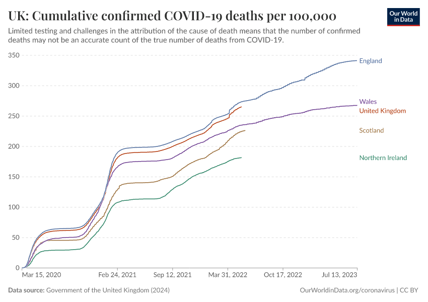 Government of the United Kingdom (2024) – with minor processing by Our World in Data. “UK: Cumulative confirmed COVID-19 deaths per 100,000” [dataset]. Government of the United Kingdom, “UKHSA data dashboard” [original data]. Retrieved March 5, 2026 from https://ai-search-suggested-topics-k.owid.pages.dev/grapher/uk-cumulative-covid-deaths-rate