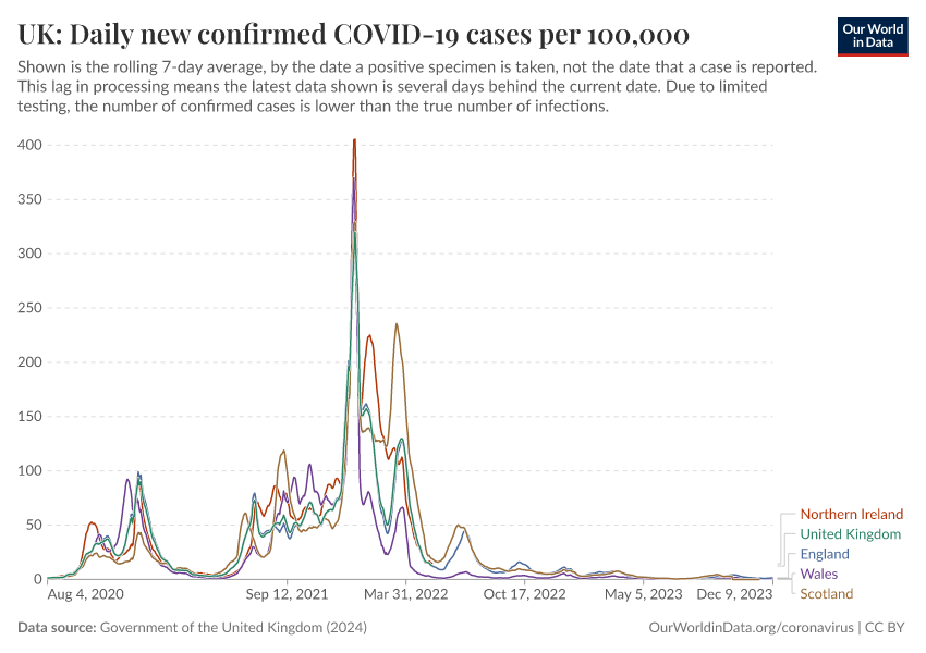 Government of the United Kingdom (2024) – with minor processing by Our World in Data. “UK: Daily new confirmed COVID-19 cases per 100,000” [dataset]. Government of the United Kingdom, “UKHSA data dashboard” [original data]. Retrieved March 5, 2026 from https://ai-search-suggested-topics-k.owid.pages.dev/grapher/uk-daily-covid-cases-7day-average