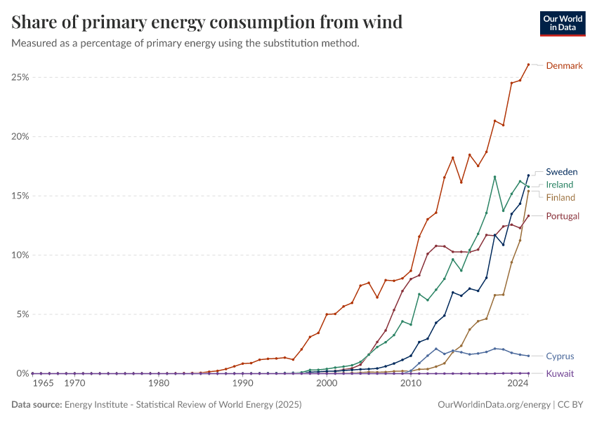 Energy Institute - Statistical Review of World Energy (2025) – with major processing by Our World in Data. “Share of primary energy consumption that comes from wind power – Using the substitution method” [dataset]. Energy Institute, “Statistical Review of World Energy” [original data]. Retrieved March 5, 2026 from https://ai-search-suggested-topics-k.owid.pages.dev/grapher/wind-share-energy