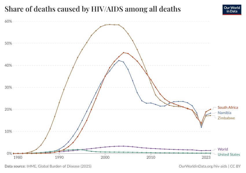 Today, the share of deaths remains high: more than 1 in 5 deaths in some countries are caused by HIV/AIDS. But in the past, this share was even higher.