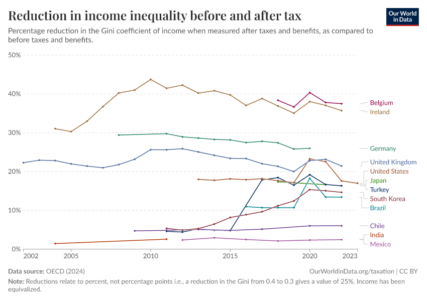 Joe Hasell (2023) - “Income inequality before and after taxes: how much do countries redistribute income?” Published online at OurWorldinData.org. Retrieved from: 'https://ai-search-suggested-topics-k.owid.pages.dev/income-inequality-before-and-after-taxes' [Online Resource]BibTeX citation