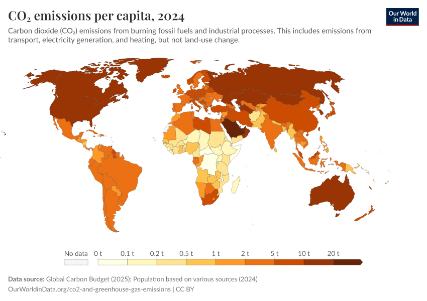 Hannah Ritchie (2019) - “Where in the world do people emit the most CO2?” Published online at OurWorldinData.org. Retrieved from: 'https://ai-search-suggested-topics-k.owid.pages.dev/per-capita-co2' [Online Resource]BibTeX citation