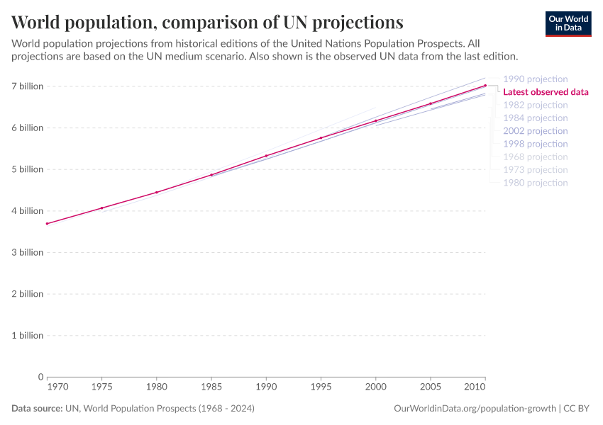Hannah Ritchie (2023) - “The UN has made population projections for more than 50 years – how accurate have they been?” Published online at OurWorldinData.org. Retrieved from: 'https://ai-search-suggested-topics-k.owid.pages.dev/population-projections' [Online Resource]BibTeX citation