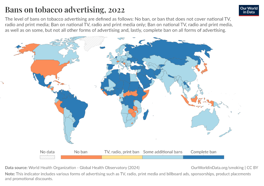 Bilano, V., Gilmour, S., Moffiet, T., d'Espaignet, E. T., Stevens, G. A., Commar, A., ... & Shibuya, K. (2015). Global trends and projections for tobacco use, 1990–2025: an analysis of smoking indicators from the WHO Comprehensive Information Systems for Tobacco Control. The Lancet, 385(9972), 966-976.