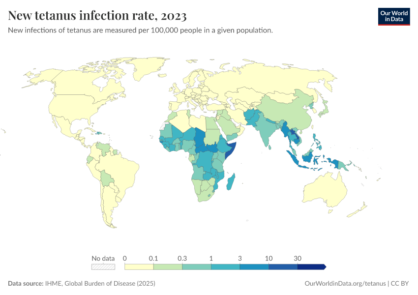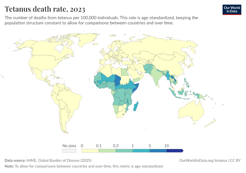 Hannah Behrens, Sophie Ochmann, Bernadeta Dadonaite, and Max Roser (2019) - “Tetanus” Published online at OurWorldinData.org. Retrieved from: 'https://ai-search-suggested-topics-k.owid.pages.dev/tetanus' [Online Resource]BibTeX citation