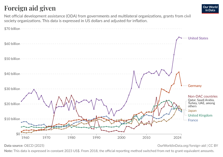 Simon van Teutem and Pablo Arriagada (2025) - “What is foreign aid? How “Official Development Assistance” is measured” Published online at OurWorldinData.org. Retrieved from: 'https://ai-search-suggested-topics-k.owid.pages.dev/what-is-foreign-aid' [Online Resource]BibTeX citation