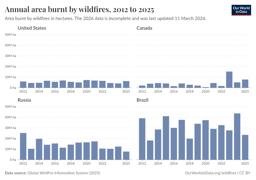 On this page, we look at data on wildfires' extent and how they are changing over time.