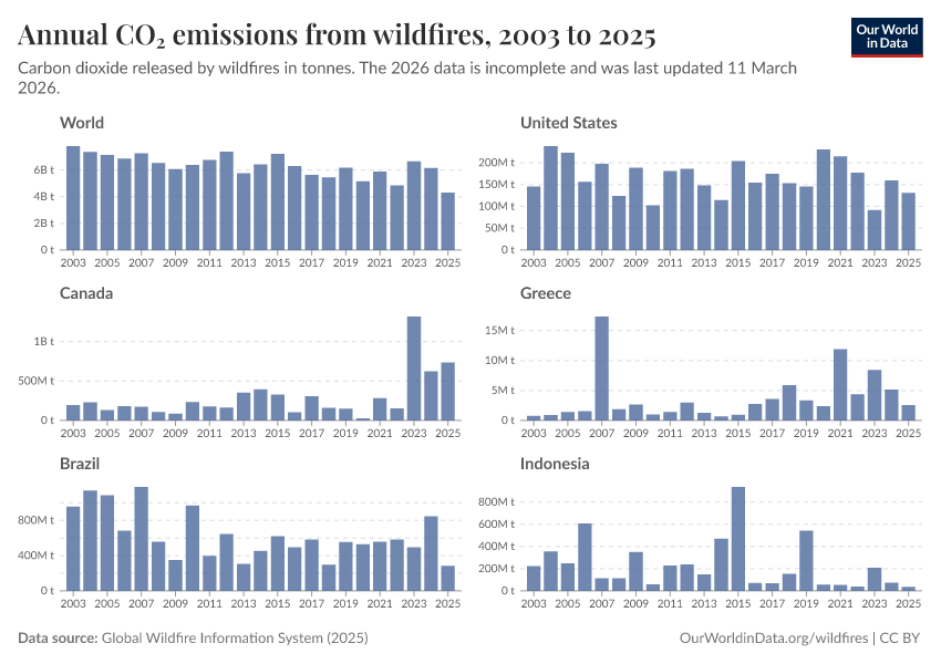 Wildfires globally add around 5 to 8 billion tonnes of CO2 each year. For context, globally, we emit around 37 billion tonnes of CO2 from fossil fuels and cement yearly.